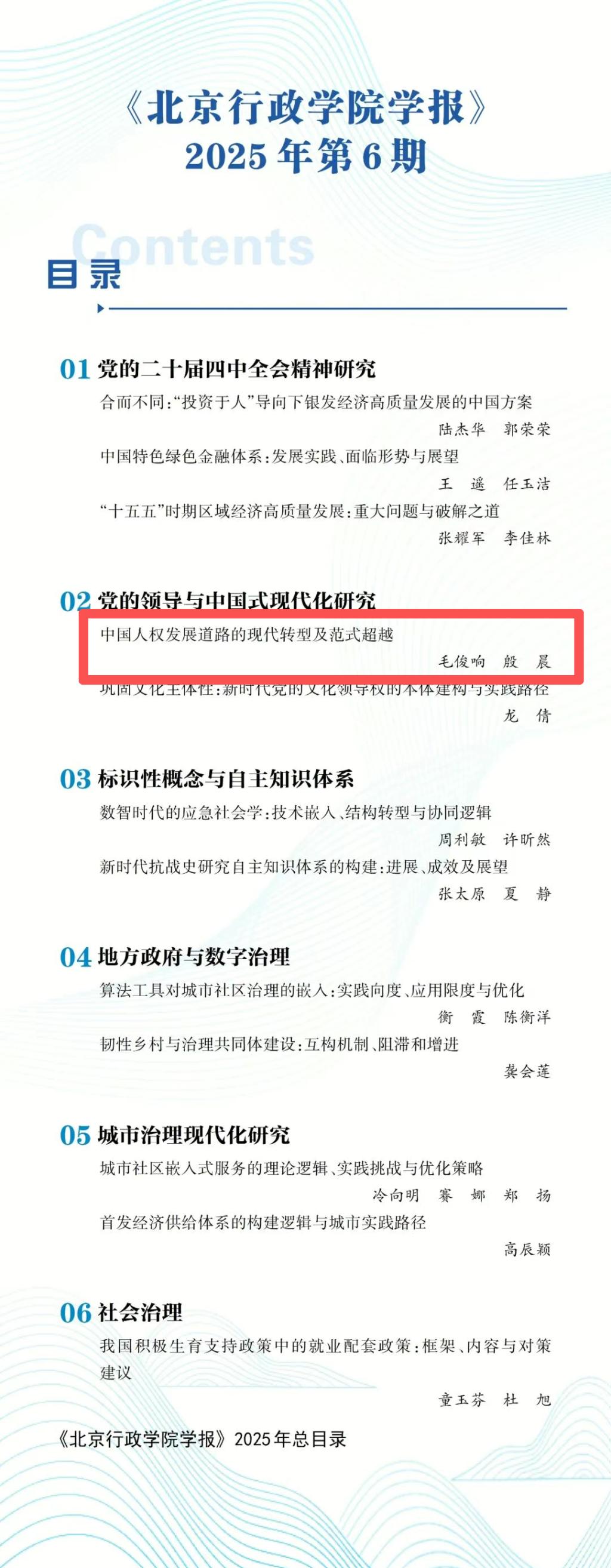 近日,中南大学人权研究中心执行主任、教授毛俊响与研究人员殷晨在《北京行政学院学报》2025年第6期发表《中国人权发展道路的现代转型及范式超越》一文。