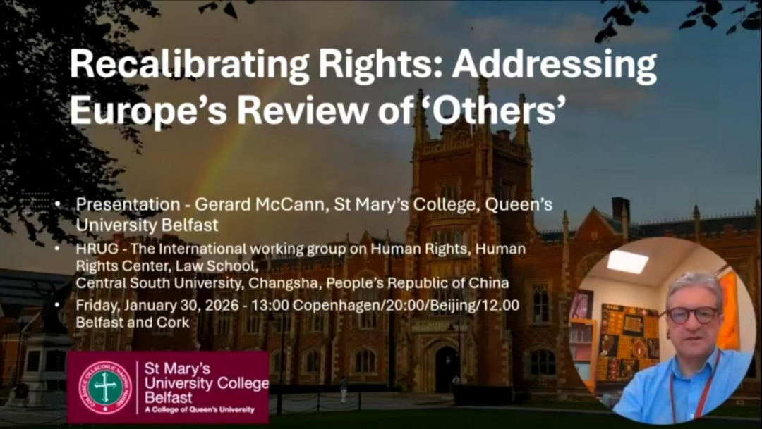 2026年1月30日,HRUG定期研讨会之“重新校准权利:审视欧洲对‘他者’的认知”主题会议顺利召开。本次会议由贝尔法斯特女王大学下属的圣玛丽大学国际研究学专职讲师Gerard McCann教授主讲,爱尔兰国立科克大学应用社会研究学院政策分析家Joe Finnerty主持,中南大学人权研究中心研究员Peter Herrmann教授、土耳其中东科技大学政治学Mehmet Okyayuz教授、中南大学人权研究中心研究员黎娟副教授等学者一同参与了讨论。会议针对欧洲权利架构的变迁,探讨了从开放到排斥的欧洲文化转向,由此引导呼吁对欧洲语境下的权力挑战进行批判性反思并探索新生之路。